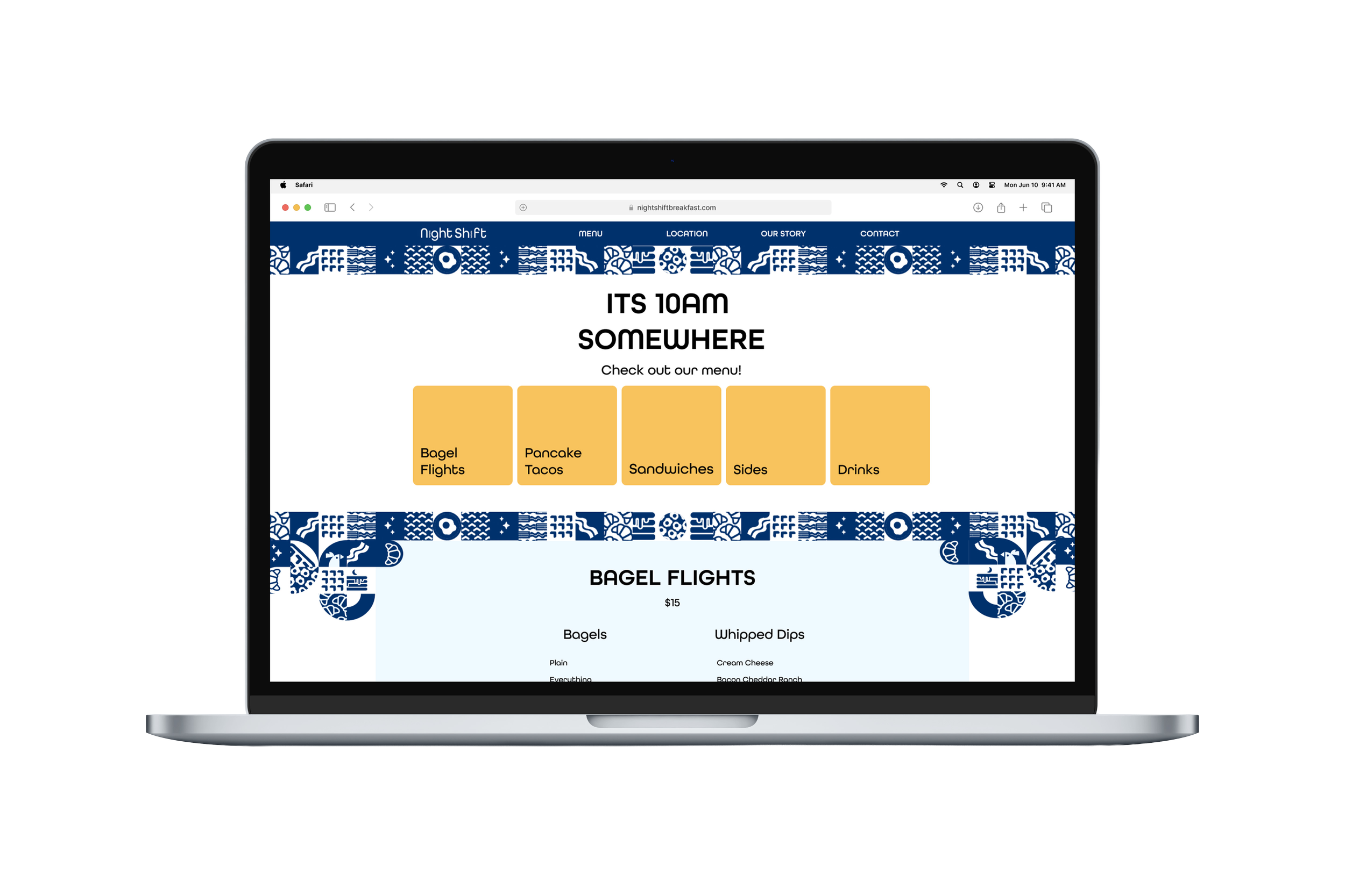 Rather than serving normal breakfast foods, Night Shift specializes in Breakfast for dinner fusion, merging iconic sweet and savory morning dishes with the late night bar food people know and love. I created two main menu items, Pancake Tacos and Bagel Flights to be Night Shift’s signature dishes along with a mocktail menu for bar crawlers to end their nights with.